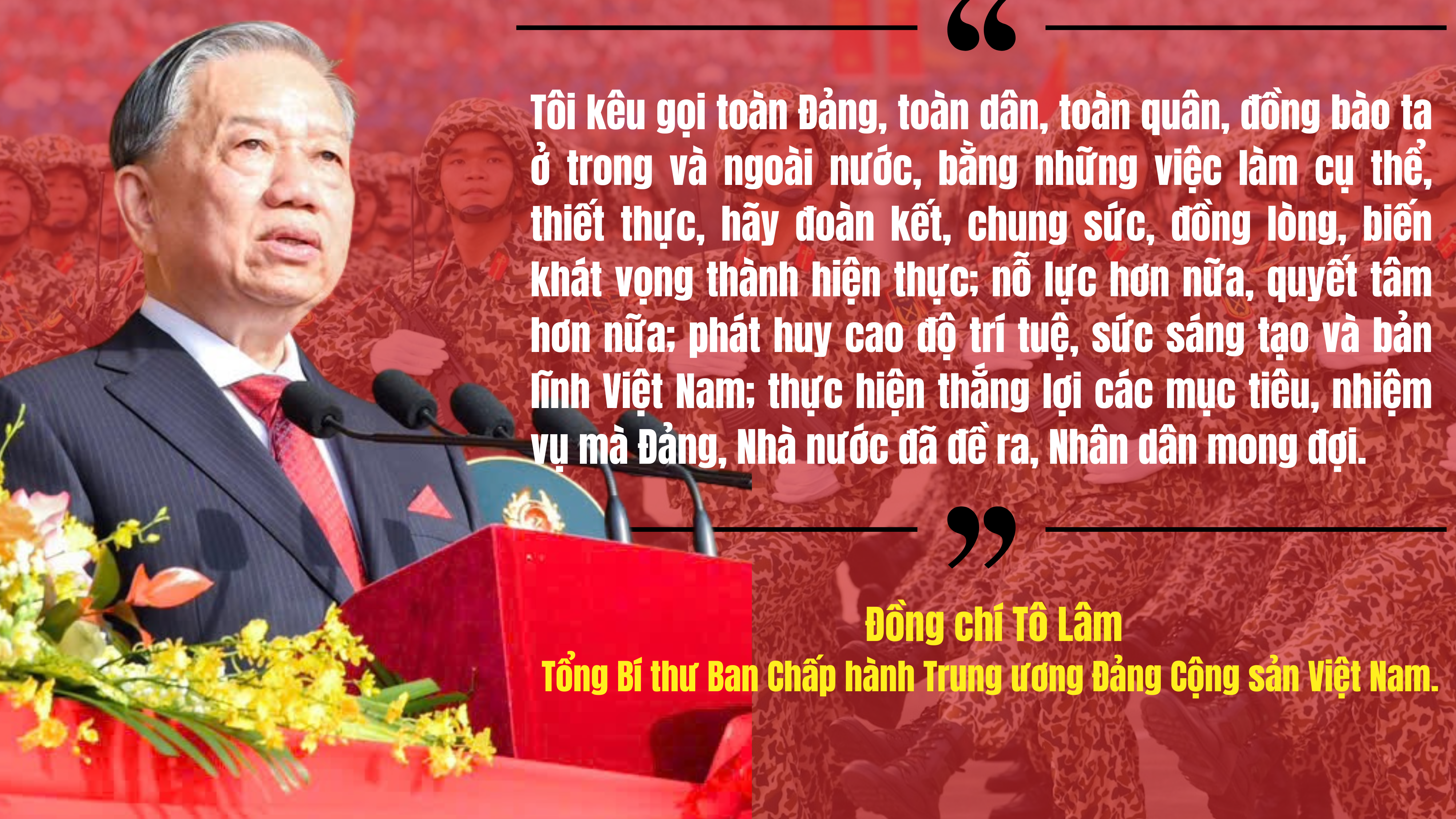 Qua chặng đường 80 năm đầy gian khó nhưng hào hùng, chúng ta đã khẳng định chân lý: Dưới ngọn cờ vinh quang của Đảng, với ánh sáng Hồ Chí Minh soi đường, dựa vào sức mạnh Nhân dân và khối đại đoàn kết toàn dân tộc, không có khó khăn, thử thách nào mà Nhân dân ta không vượt qua; không có mục tiêu cao đẹp nào mà dân tộc ta không đạt tới. Chính vì vậy, không có lực cản nào, không có lý do gì có thể ngăn bước chúng ta vươn tới hòa bình, thịnh vượng, dân tộc ta trường tồn và phát triển.