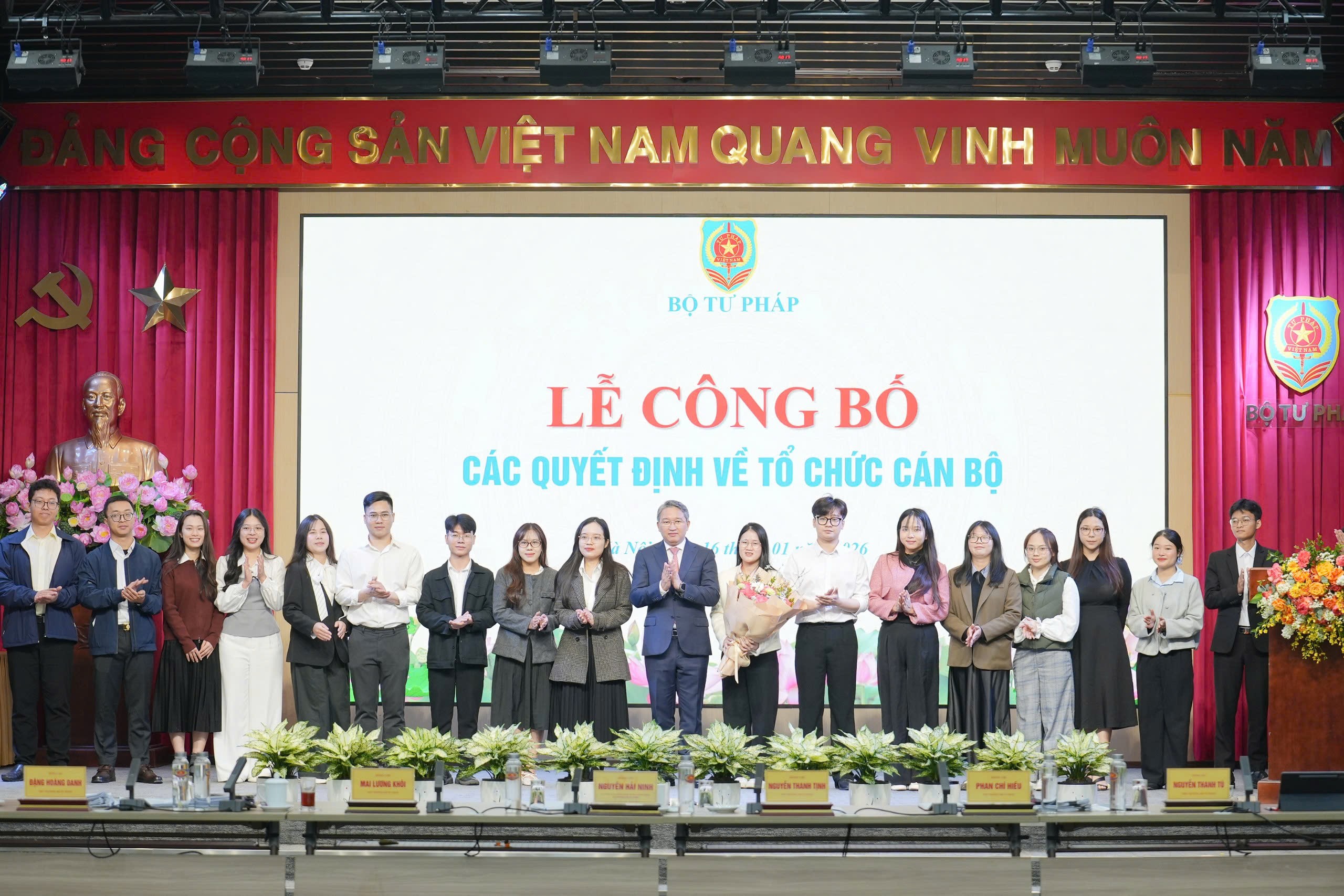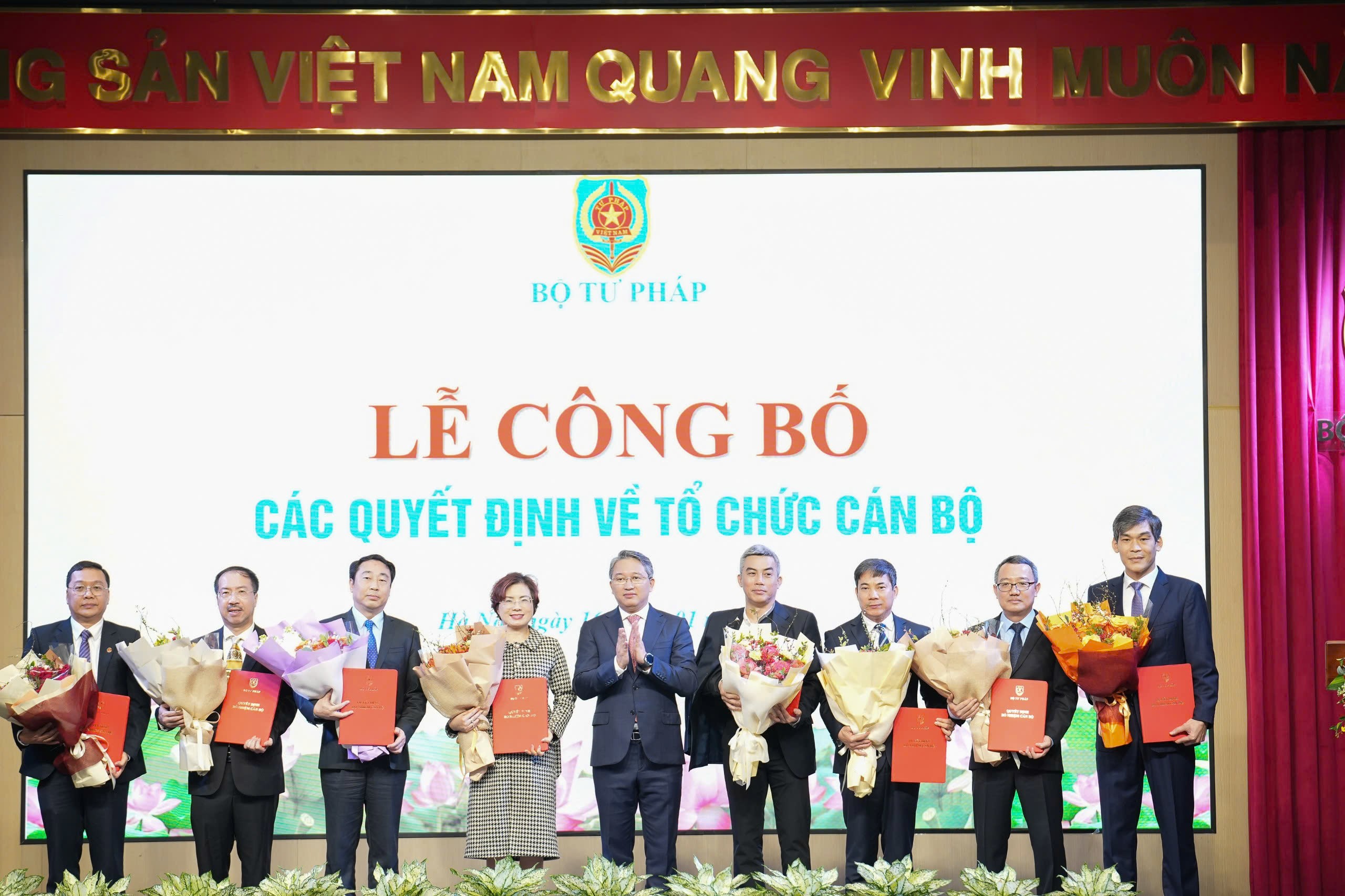 Tại Hội nghị, Vụ trưởng Vụ Tổ chức cán bộ Phan Thị Hồng Hà công bố Nghị định của Chính phủ về chức năng, nhiệm vụ quyền hạn, cơ cấu tổ chức của Bộ Tư pháp và các Quyết định về công tác cán bộ đối với 40 đồng chí. Trong đó: