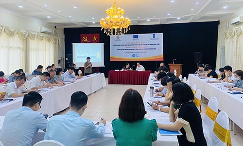 Ông Đặng Thanh Sơn, Cục trưởng Cục Quản lý xử lý vi phạm hành chính và theo dõi thi hành pháp luật và bà Đào Thị Thu An, Quản lý Dự án tăng cường pháp luật và tư pháp tại Việt Nam (EU JULE), UNDP đồng chủ trì Hội thảo.