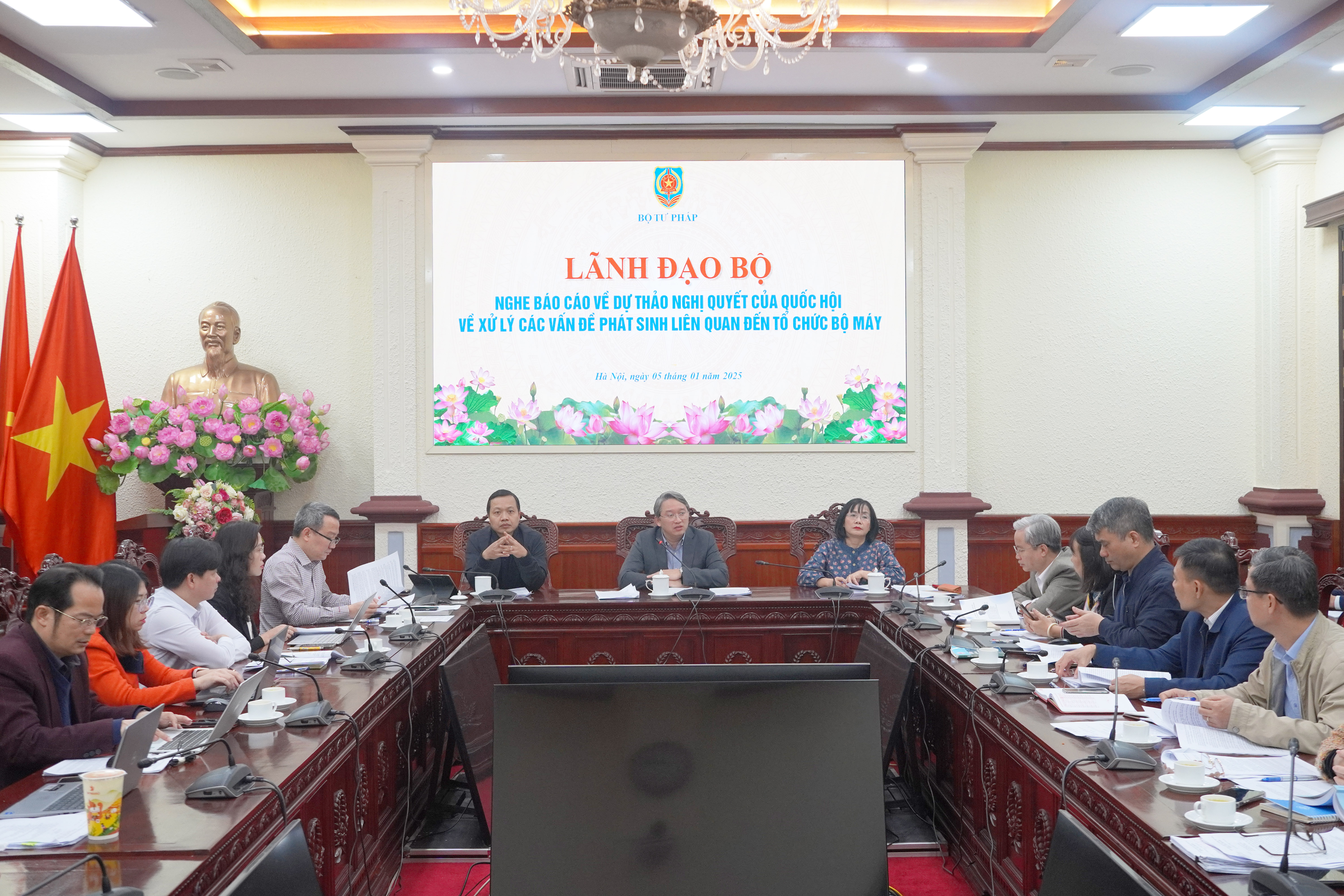 Kết luận buổi làm việc, đồng chí Nguyễn Hải Ninh, Bộ trưởng Bộ Tư pháp ghi nhận sự cố gắng, nỗ lực của Cục Kiểm tra văn bản quy phạm pháp luật trong việc phối hợp với các bộ, ngành, địa phương hoàn thiện bộ hồ sơ đề nghị xây dựng dự thảo Nghị quyết. Bên cạnh đó, Bộ trưởng cũng yêu cầu cần phải rà soát lại những vấn đề đặc thù từ Điều 13 đến Điều 17 dự thảo Nghị quyết cần bao quát những trường hợp phát sinh liên quan đến sắp xếp tổ chức bộ máy và chỉ nêu những nội dung không thể xử lý bằng nguyên tắc chung. Bộ trưởng cũng đề nghị tham khảo thêm Nghị quyết số 20/NQ-CP ngày 17/02/2023 của Chính phủ về một số nhiệm vụ, giải pháp triển khai sắp xếp tổ chức bộ máy của các bộ, cơ quan ngang bộ, cơ quan thuộc Chính phủ để điều chỉnh bố cục dự thảo Nghị quyết này cho phù hợp. Liên quan đến điều khoản chuyển tiếp của dự thảo Nghị quyết, Bộ trưởng đề nghị cần tách riêng biệt điều khoản chuyển tiếp để không tồn tại “khoảng trống”. Bộ trưởng cũng yêu cầu cần ban hành văn bản gửi các địa phương về việc khẩn trương rà soát các vấn đề phát sinh về các văn bản quy phạm pháp luật trong thực hiện sắp xếp tổ chức bộ máy để kịp thời tổng hợp, phục vụ cho việc xây dựng Nghị quyết./.