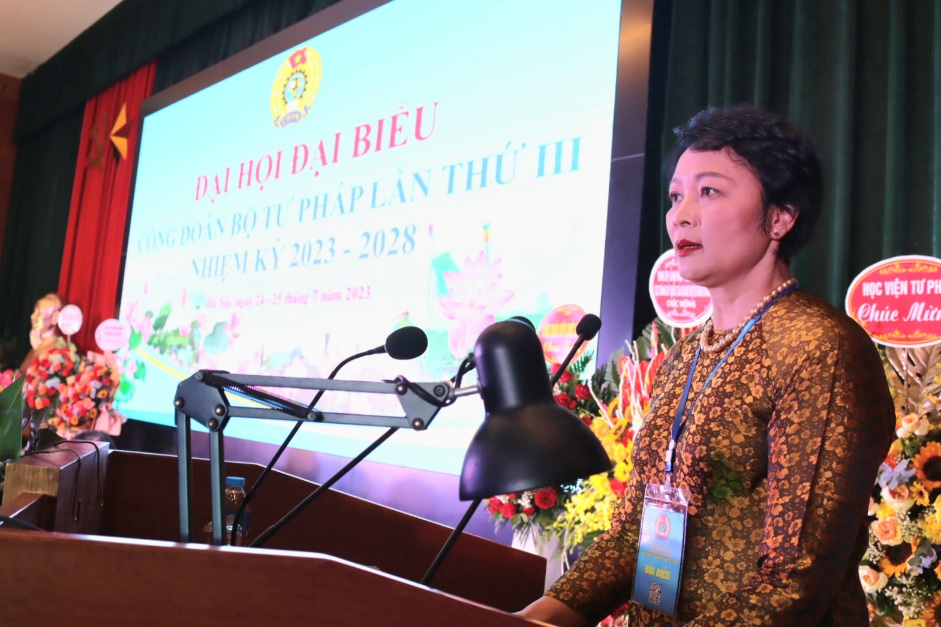 Phát biểu khai mạc Đại hội, Chủ tịch Công đoàn Bộ Tư pháp Khương Thị Thanh Huyền cho biết, Đại hội lần này có nhiệm vụ kiểm điểm sâu sắc, toàn diện kết quả công tác công đoàn và phong trào công chức, viên chức người lao động của Bộ Tư pháp; kiểm điểm hoạt động của Ban chấp hành Công đoàn nhiệm kỳ kéo dài 2015-2023. Đồng thời, đóng góp ý kiến vào Dự thảo sửa đổi bổ sung điều lệ công đoàn Việt Nam và tổng hợp ý kiến và báo cáo chính trị của Đại hội Công đoàn viên chức Việt Nam lần thứ VI; lựa chọn những đồng chí thực sự tiêu biểu về phẩm chất chính trị, đạo đức, năng lực lãnh đạo quản lý, trí tuệ phù hợp với công đoàn, đủ sức lãnh đạo công đoàn trước yêu cầu đặt ra để bầu vào Ban chấp hành công đoàn Bộ Tư pháp lần thứ III và bầu đoàn đại biểu đi dự Đại hội Công đoàn viên chức Việt Nam lần thứ VI.