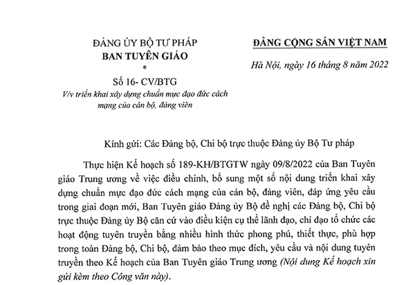Thực hiện Kế hoạch số 189-KH/BTGTW, Ban Tuyên giáo Đảng ủy Bộ Tư pháp đã ban hành Công văn số 16-CV/BTG ngày 16/8/2022 về việc triển khai xây dựng chuẩn mực đạo đức cách mạng của cán bộ, đảng viên, theo đó, đề nghị các Đảng bộ, Chi bộ trực thuộc Đảng ủy Bộ căn cứ vào điều kiện cụ thể lãnh đạo, chỉ đạo tổ chức các hoạt động tuyên truyền bằng nhiều hình thức phong phú, thiết thực, phù hợp trong toàn Đảng bộ, Chi bộ, bảo đảm theo mục đích, yêu cầu và nội dung tuyên truyền theo Kế hoạch của Ban Tuyên giáo Trung ương.