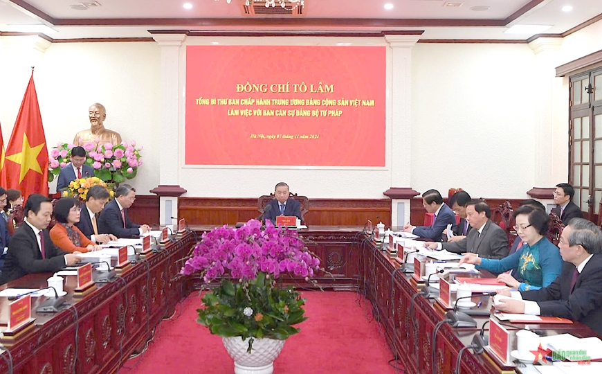 Kết luận buổi làm việc, Tổng Bí thư Tô Lâm ghi nhận, đánh giá cao và chúc mừng những thành tích, kết quả mà Bộ, ngành Tư pháp đã đạt được trong thời gian vừa qua. Tuy nhiên, Tổng Bí thư đã chỉ rõ, bên cạnh kết quả, công tác hoàn thiện thể chế, trọng tâm là xây dựng, hoàn thiện pháp luật vẫn còn nhiều tồn tại, hạn chế mà Bộ, ngành Tư pháp cần sớm có giải pháp khắc phục như: (i) Một số chủ trương, định hướng lớn của Đảng chưa được thể chế kịp thời, đầy đủ hoặc đã thể chế nhưng tính khả thi không cao. (ii) Chất lượng xây dựng, hoàn thiện pháp luật chưa đáp ứng yêu cầu thực tiễn, một số luật mới ban hành đã phải sửa đổi; các quy định chưa thực sự đồng bộ, còn chồng chéo, nhiều quy định còn chưa rõ ràng, rườm rà, cản trở việc thực thi, gây thất thoát, lãng phí các nguồn lực; chưa tạo môi trường thực sự thuận lợi để thúc đẩy đổi mới sáng tạo, thu hút nguồn lực của các nhà đầu tư trong và ngoài nước, chưa khơi thông nguồn lực trong dân. Việc phân cấp, phân quyền, phần lớn chỉ dừng ở chủ trương, chưa thể hiện nhiều trong các văn bản pháp luật, chưa triệt để, chưa rõ trách nhiệm, vẫn tập trung nhiều ở Trung ương; việc cắt giảm một số quy định, thủ tục hành chính còn hạn chế. Tổ chức thực thi pháp luật, chính sách vẫn là khâu yếu; chưa có cơ chế hữu hiệu để nhận diện và phản ứng chính sách kịp thời. Việc sắp xếp, kiện toàn tổ chức bộ máy hành chính nhà nước chưa tinh gọn, hiệu lực, hiệu quả hoạt động chưa cao; việc giảm đầu mối, giảm cấp trung gian còn bất cập. Việc nghiên cứu, ban hành chính sách, quy định pháp luật điều chỉnh đối với những vấn đề mới còn chậm, chưa tạo khuôn khổ pháp lý thúc đẩy được các động lực tăng trưởng mới. (iii) Dấu hiệu bị tác động, “lợi ích nhóm” trong quá trình xây dựng, thẩm định các văn bản pháp luật là đáng lo ngại, gây ra thiệt hại, thậm chí tạo khúc quanh đối với phát triển.