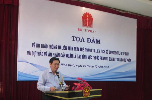 Triển khai thực hiện Nghị định số 22/2013/NĐ-CP ngày 13/3/2013 của Chính phủ quy định chức năng, nhiệm vụ, quyền hạn và cơ cấu tổ chức của Bộ Tư pháp, ngày 26/10/2013 tại Ninh Bình, Bộ Tư pháp đã tổ chức Tọa đàm về dự thảo Thông tư liên tịch thay thế Thông tư liên tịch số 01/2009/TTLT-BTP-BNV ngày 28/4/2009 và dự thảo Đề án phân cấp quản lý các lĩnh vực thuộc phạm vi quản lý của Bộ Tư pháp. Tham dự Tọa đàm có các đại biểu đại diện Bộ Tư pháp, Bộ Nội vụ, đại diện của Sở Tư pháp, Sở Nội vụ các tỉnh, thành phố trực thuộc trung ương khu vực phía Bắc. Thứ trưởng Bộ Tư pháp Lê Hồng Sơn tham dự và chủ trì Tọa đàm.