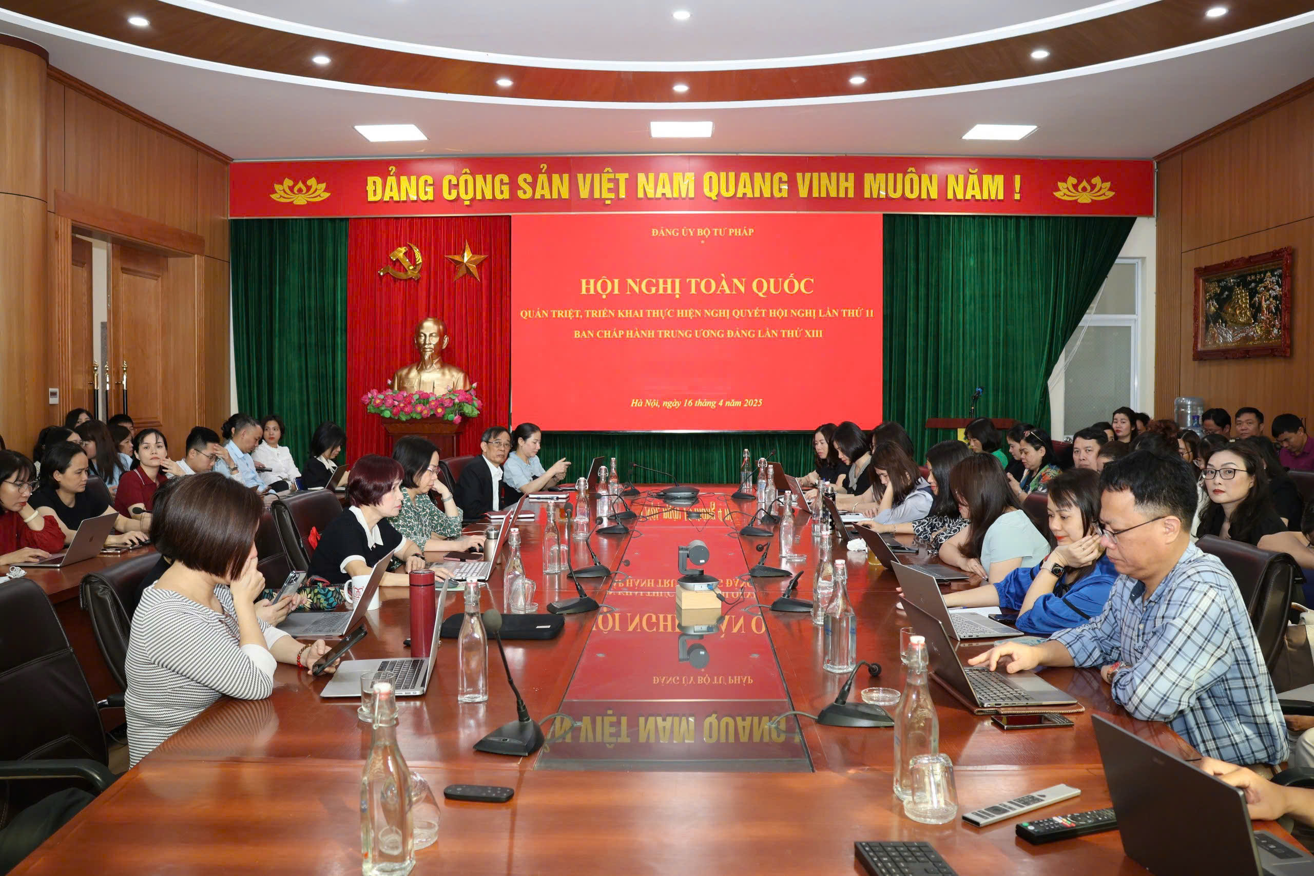 Tại điểm cầu Bộ Tư pháp có sự tham gia của đồng chí Nguyễn Thanh Tịnh, Phó Bí thư Thường trực Đảng ủy, Thứ trưởng Bộ Tư pháp; đồng chí Đặng Hoàng Oanh, Ủy viên Ban Thường vụ Đảng ủy, Thứ trưởng Bộ Tư pháp; đồng chí Nguyễn Thanh Tú, Ủy viên Ban Thường vụ Đảng ủy, Thứ trưởng Bộ Tư pháp; đồng chí Nguyễn Thanh Ngọc, Ủy viên Ban Thường vụ Đảng ủy, Thứ trưởng Bộ Tư pháp; đồng chí Nguyễn Quang Thái, Phó Bí thư chuyên trách Đảng ủy Bộ Tư pháp; đồng chí Phan Thị Hồng Hà, Ủy viên Ban Thường vụ Đảng ủy Bộ Tư pháp, Vụ trưởng Vụ Tổ chức cán bộ; cùng các đồng chí Ủy viên Ban Chấp hành Đảng ủy, Ủy ban Kiểm tra, Ban Tổ chức, Ban Tuyên giáo và Dân vận, Văn phòng Đảng ủy Bộ, Bí thư các đảng bộ, chi bộ trực thuộc Đảng bộ Bộ, Thủ trưởng các đơn vị thuộc Bộ, Chủ tịch Công đoàn Bộ, Bí thư Đoàn Thanh niên Bộ, Chủ tịch Hội Cựu chiến binh Bộ, Chi hội trưởng Chi hội Luật gia Bộ Tư pháp.