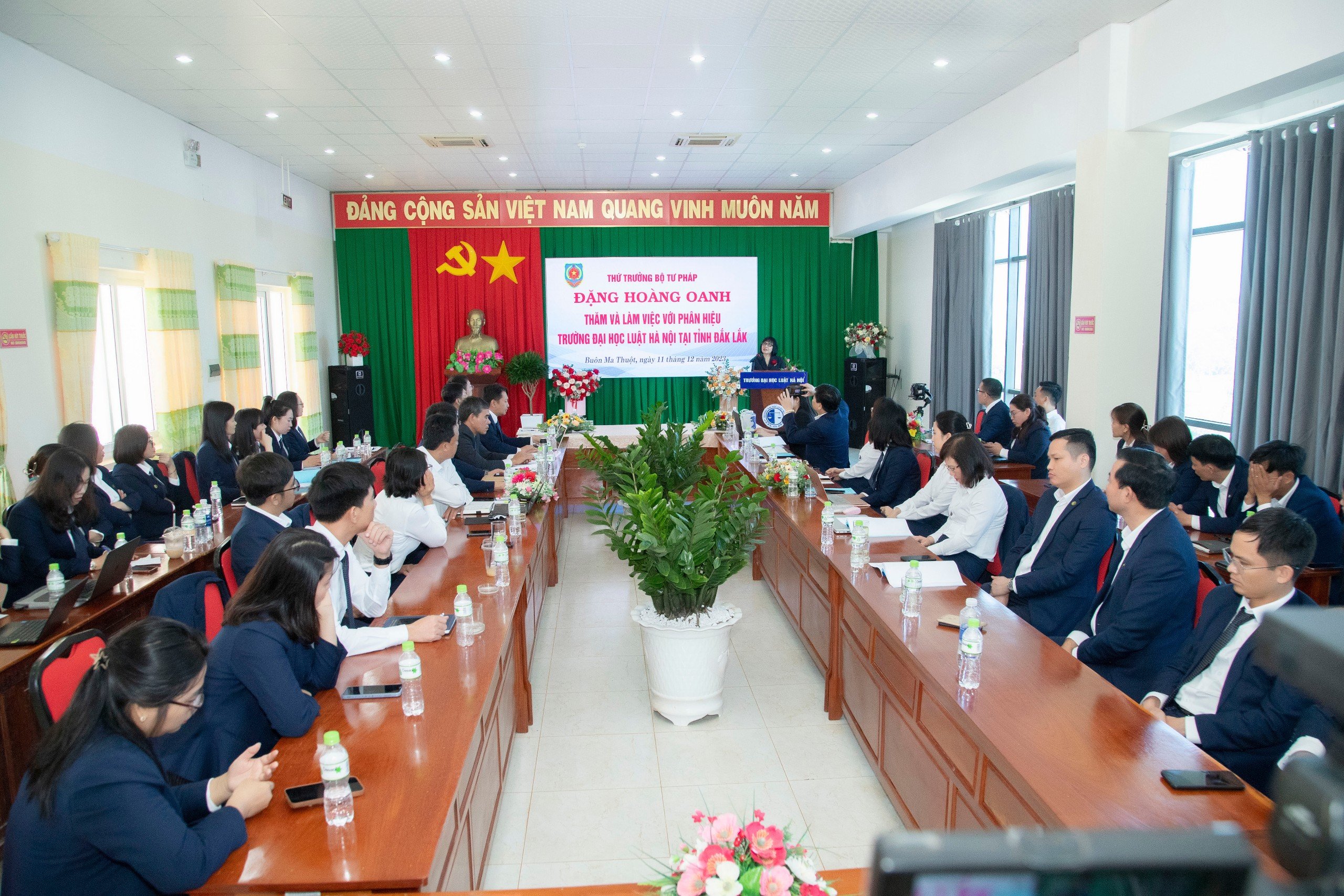 Phát biểu chỉ đạo tại buổi làm việc, Thứ trưởng Đặng Hoàng Oanh ghi nhận và đánh giá cao các kết quả đã đạt được của Phân hiệu. Thực hiện chủ trương rà soát, sắp xếp lại các đơn vị sự nghiệp công lập thuộc Bộ Tư pháp theo yêu cầu của Nghị quyết số 08/NQ-CP ngày 24/01/2018 của Chính phủ về Chương trình hành động thực hiện Nghị quyết số 19-NQ/TW ngày 25/10/2017 của Hội nghị lần thứ sáu Ban Chấp hành Trung ương khóa XII về tiếp tục đổi mới hệ thống tổ chức và quản lý, nâng cao chất lượng và hiệu quả hoạt động của các đơn vị sự nghiệp công lập, Ban cán sự Đảng, Lãnh đạo Bộ Tư pháp quyết định thành lập Phân hiệu Trường Đại học Luật Hà Nội tại tỉnh Đắk Lắk và giải thể Trường Trung cấp Luật Buôn Ma Thuột. Đây là quyết định hoàn toàn đúng đắn, kịp thời của Ban cán sự đảng, Lãnh đạo Bộ Tư pháp trong việc sắp xếp và đổi mới hệ thống tổ chức các đơn vị sự nghiệp công lập thuộc Bộ theo chủ trương của Đảng, Chính phủ.