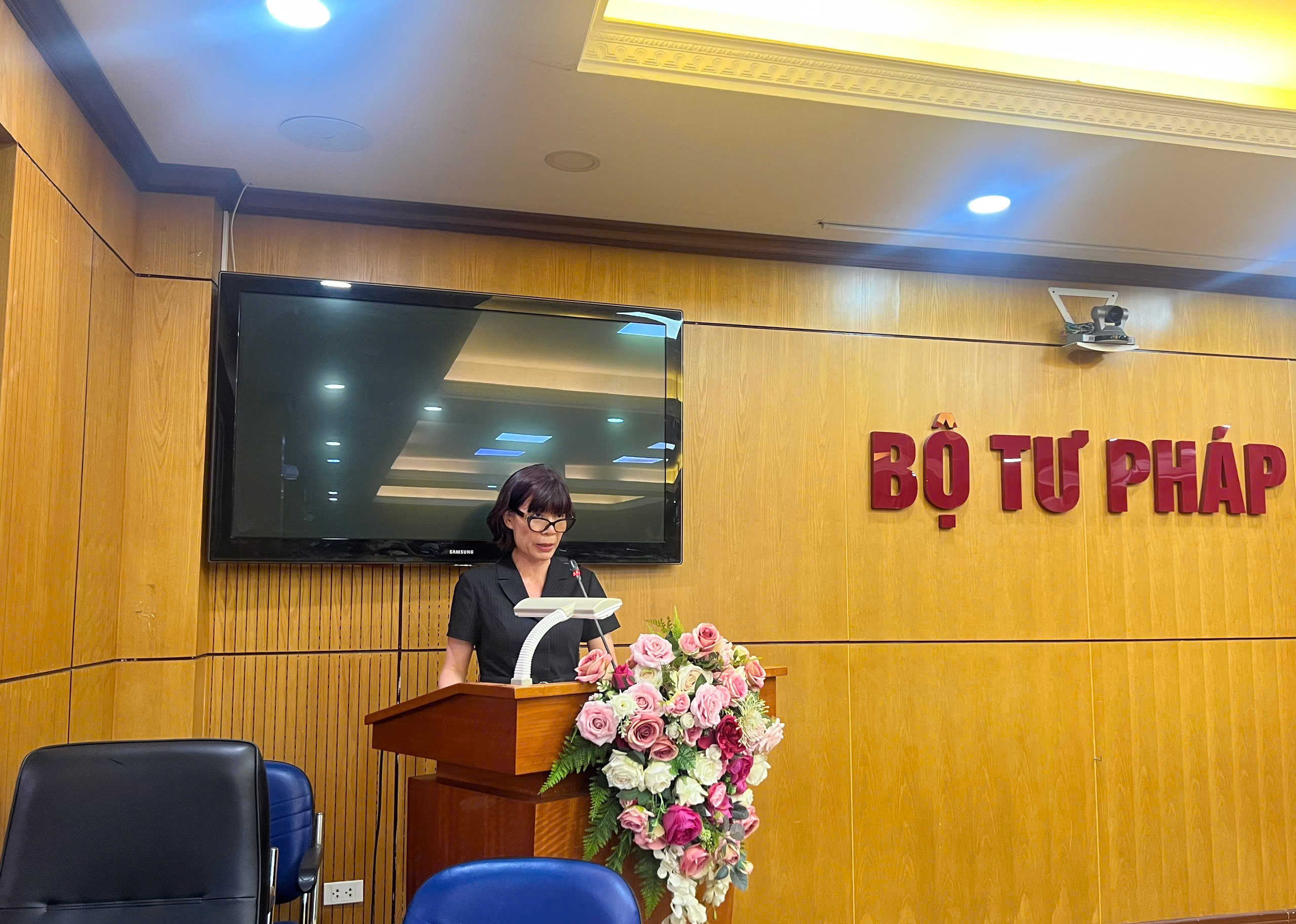 Đồng chí Lê Thị Hòa, Phó Vụ trưởng Vụ Pháp luật hình sự - hành chính phát biểu tại Hội nghị