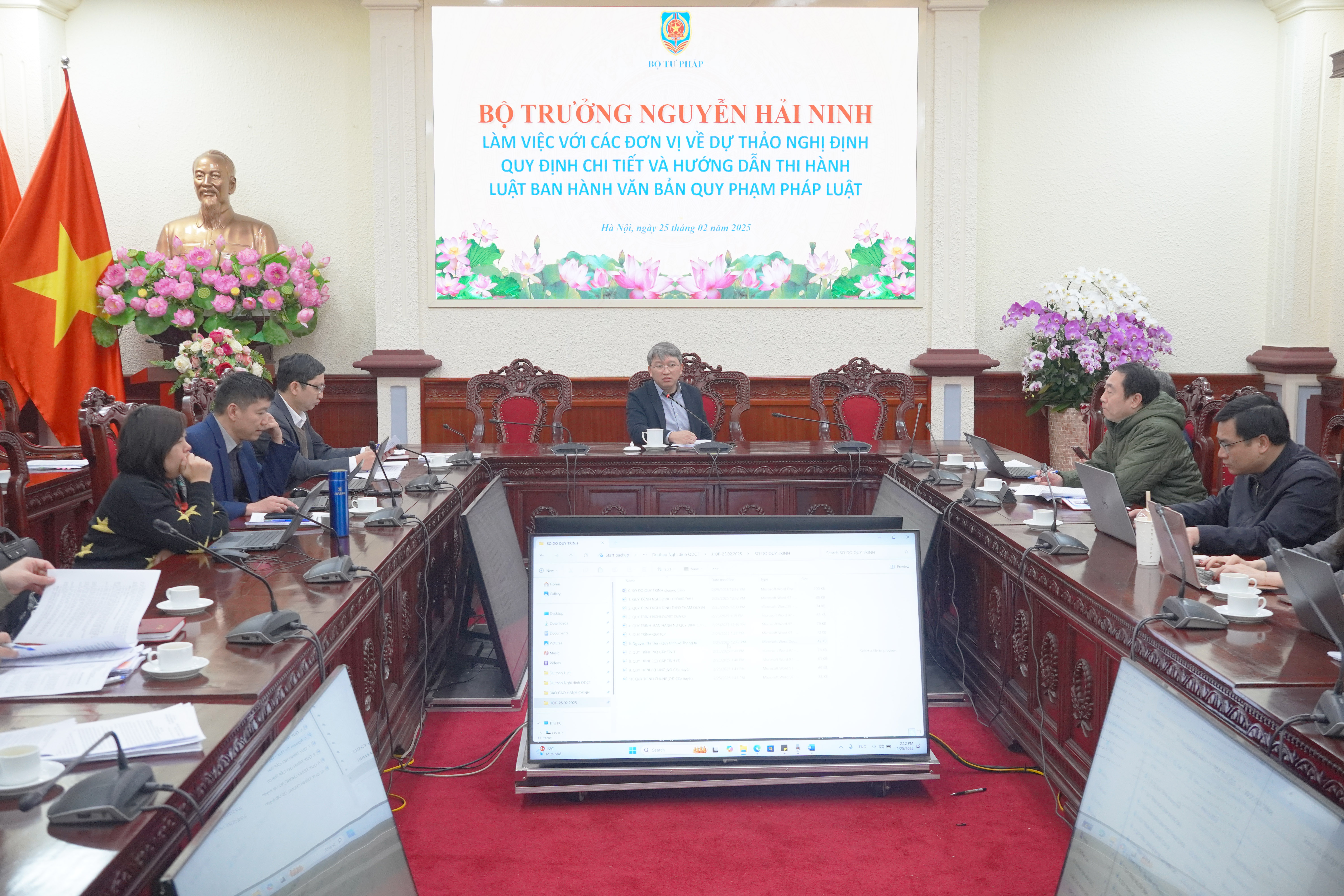 Tại buổi làm việc, các đại biểu tham dự đã phát biểu ý kiến về các nội dung lớn, quan trọng trong dự thảo Nghị định quy định chi tiết một số điều và biện pháp để tổ chức, hướng dẫn thi hành Luật Ban hành văn bản quy phạm pháp luật, cụ thể: (i) các vấn đề liên quan đến quy trình xây dựng các văn bản dưới luật trong dự thảo Nghị định; (ii) các vấn đề liên quan đến định hướng lập pháp nhiệm kỳ và chương trình lập pháp hằng năm của Quốc hội; (iii) các vấn đề liên quan đến quy trình soạn thảo, thành phần hồ sơ quy định báo cáo đánh giá tác động của chính sách đối với nghị định của Chính phủ điều chỉnh những vấn đề mới, vấn đề chưa có văn bản pháp lý cao hơn nghị định điều chỉnh (nghị định “không đầu”); (iv) cân nhắc việc đánh giá tác động của chính sách đối với nghị quyết thí điểm của Chính phủ, nghị quyết thí điểm của Hội đồng nhân dân cấp tỉnh, nghị quyết quy định về biện pháp khác có tính chất đặc thù phù hợp với điều kiện phát triển kinh tế - xã hội của địa phương theo quy định của Luật Tổ chức chính quyền địa phương năm 2025; (v) cân nhắc việc đưa bảng so sánh giữa dự thảo văn bản quy phạm pháp luật mới và văn bản quy phạm pháp luật cũ trong thành phần hồ sơ hay không; (vi) các vấn đề liên quan đến kinh phí và nguồn lực; lấy ý kiến các đơn vị có liên quan; thẩm định; thẩm định lại…
