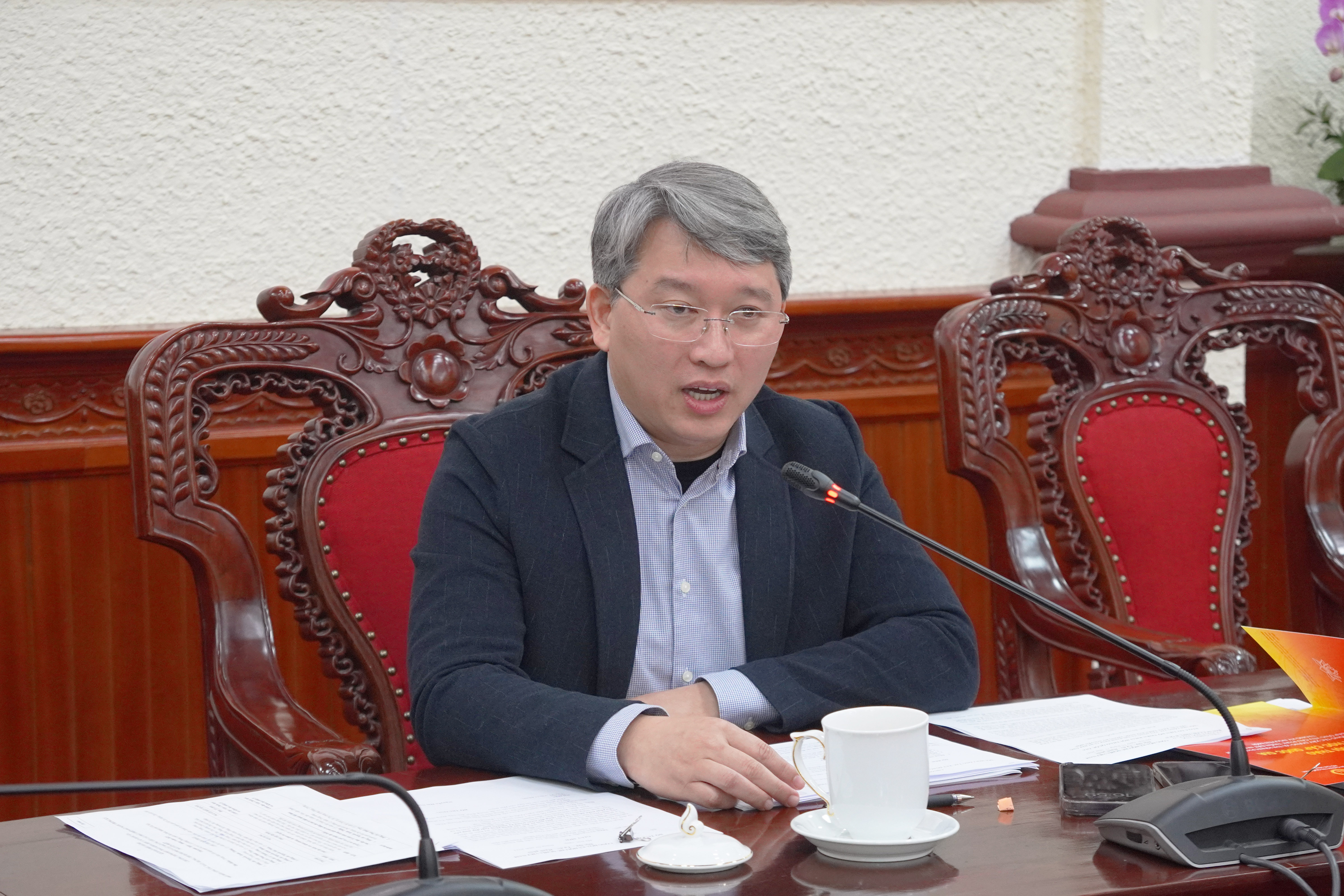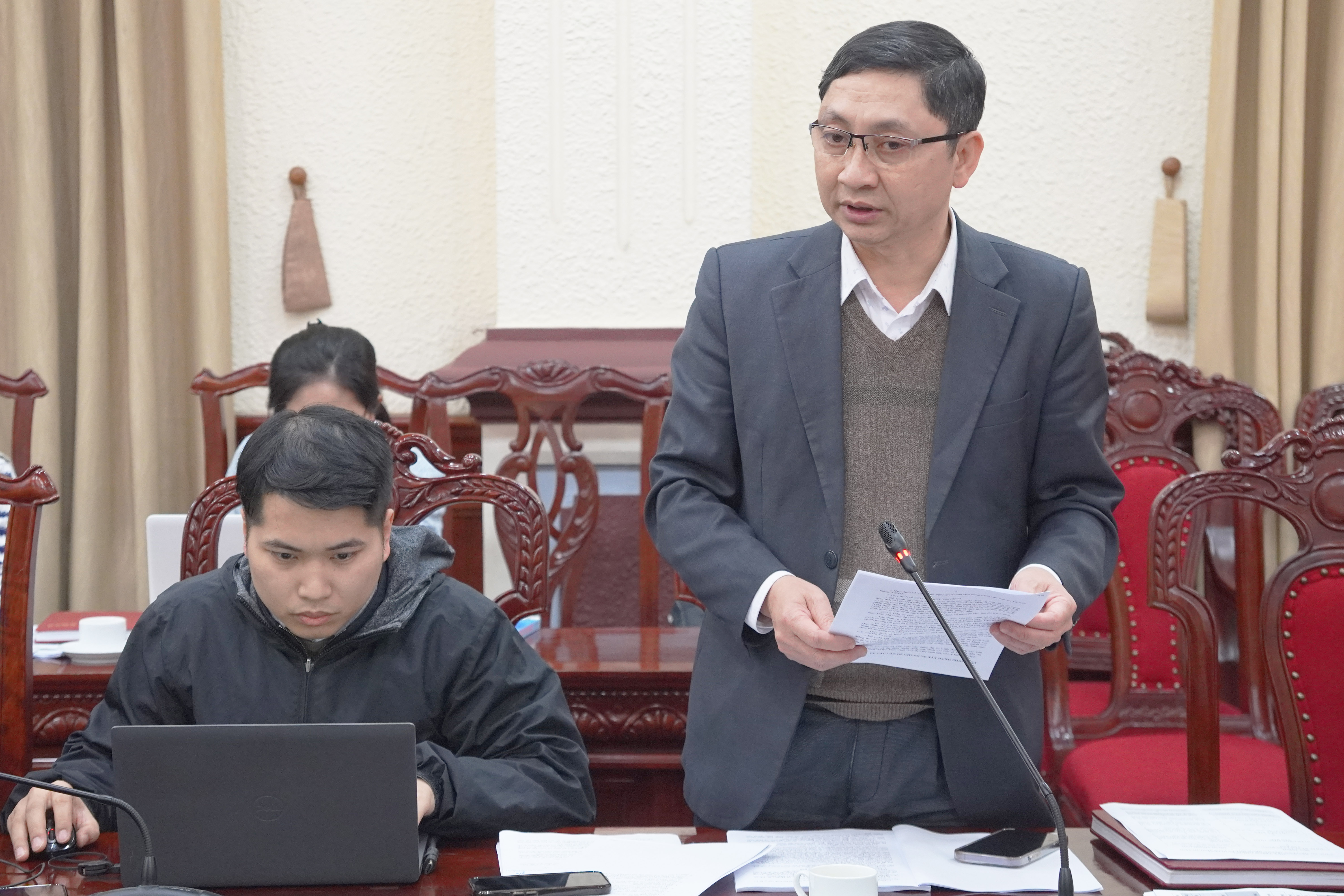 Đồng chí Trần Anh Đức, Vụ trưởng Vụ Các vấn đề chung về xây dựng pháp luật phát biểu tại buổi làm việc.