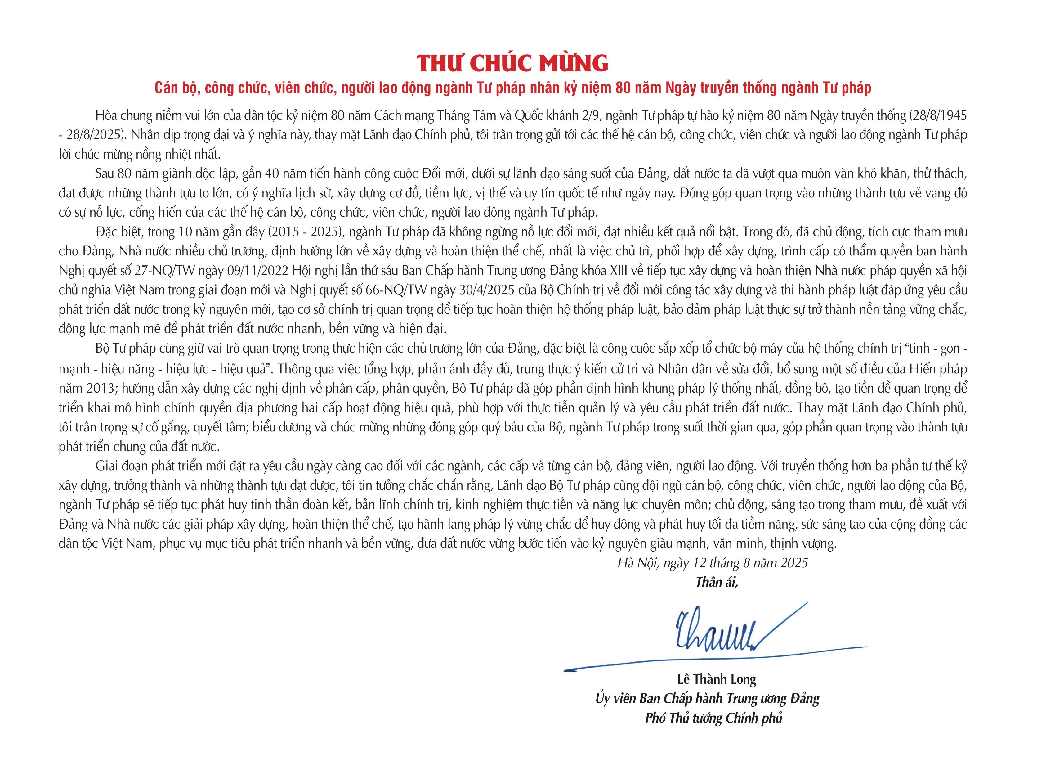 Thư chúc mừng của Phó Thủ tướng Chính phủ