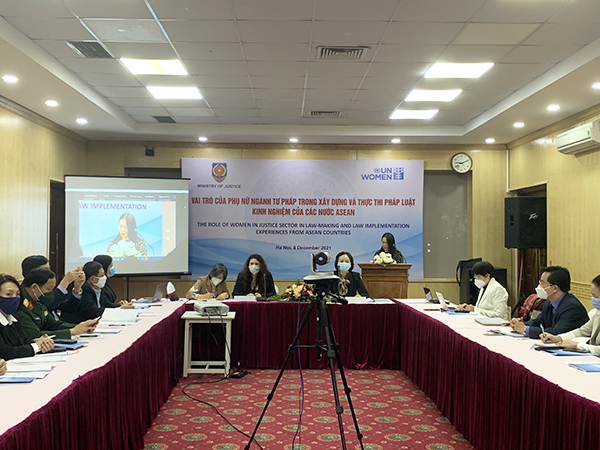 Ngày 08/12/2021, Công đoàn Bộ Tư pháp phối hợp với Cơ quan Liên hợp quốc về bình đẳng giới và trao quyền cho phụ nữ (UN Women) tổ chức Tọa đàm “Vai trò của phụ nữ Ngành Tư pháp trong xây dựng và thực thi pháp luật - Kinh nghiệm của các nước ASEAN”. Tọa đàm được tổ chức dưới sự chủ trì của bà Khương Thị Thanh Huyền - Chủ tịch Công đoàn Bộ Tư pháp và bà Gaelle Demolis - Quyền Trưởng đại diện Cơ quan Liên hợp quốc về bình đẳng giới và trao quyền cho phụ nữ (UN Women), với sự tham gia của nhiều chuyên gia trong công tác xây dựng và thực thi pháp luật ở Trung ương và địa phương.