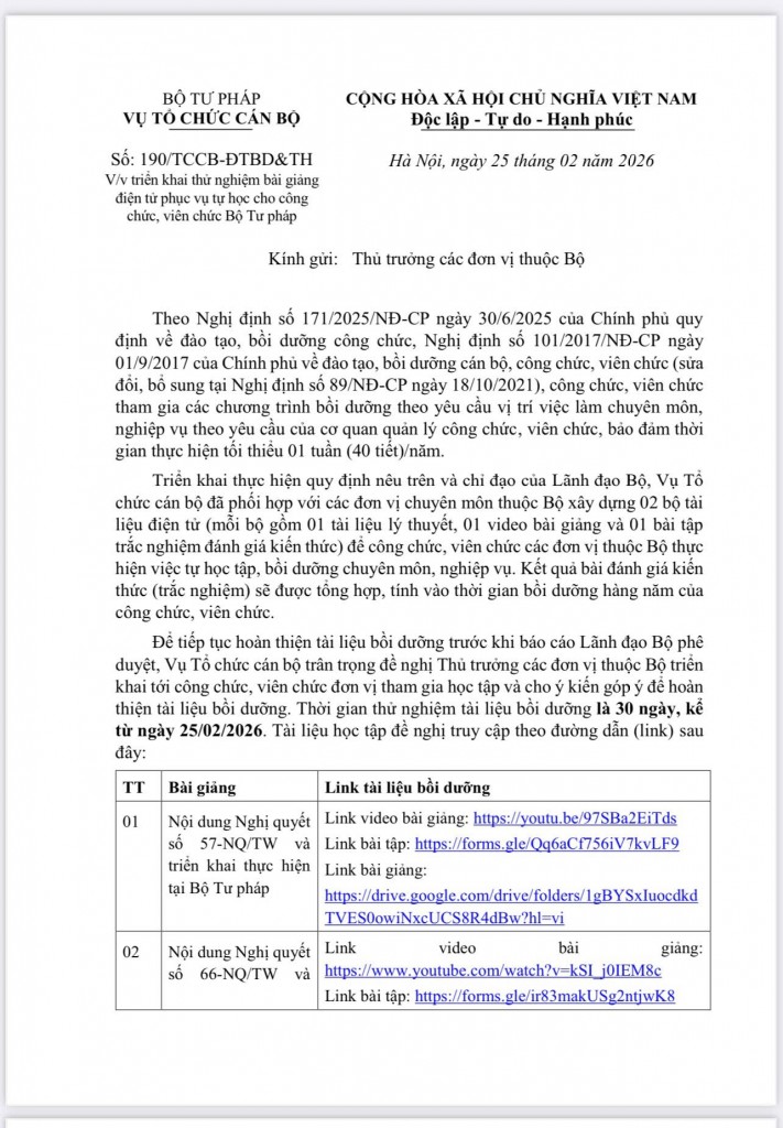 Ngày 25/02, Vụ Tổ chức cán bộ - Bộ Tư pháp đã ban hành Công văn số 190/TCCB-ĐTBD&TH về việc triển khai thử nghiệm bộ bài giảng điện tử phục vụ tự học dành cho đội ngũ công chức, viên chức Bộ Tư pháp.