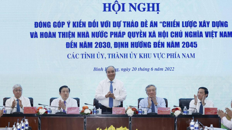 Hôm qua (20/6), tại Bình Dương, Chủ tịch nước Nguyễn Xuân Phúc, Trưởng Ban Chỉ đạo xây dựng Đề án “Chiến lược xây dựng và hoàn thiện Nhà nước pháp quyền xã hội chủ nghĩa Việt Nam đến năm 2030, định hướng đến năm 2045” đã chủ trì Hội nghị lấy ý kiến đóng góp của các tỉnh ủy, thành ủy trực thuộc Trung ương khu vực phía Nam vào Dự thảo Đề án.